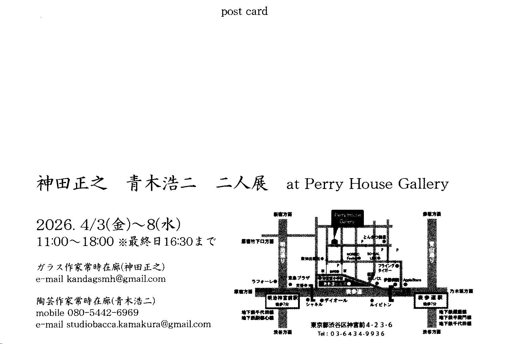 神田正之 青木浩二 二人展 会期:2026年4月3日(金)〜8日(水) OPEN11:00~18:00 (最終日16:30まで) 会場:Perty House Gallery 〒171-0031 東京都渋谷区神宮前4-23-6 TEL:03-6434-9936